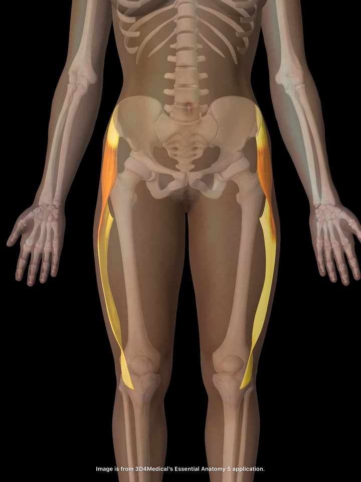 これは、大腿筋膜張筋(股関節の前の付け根から始まる筋肉)が緊張していて、その延長にある腸脛靭帯や大腿外側部の筋膜もテンションが上がっている状態になります。