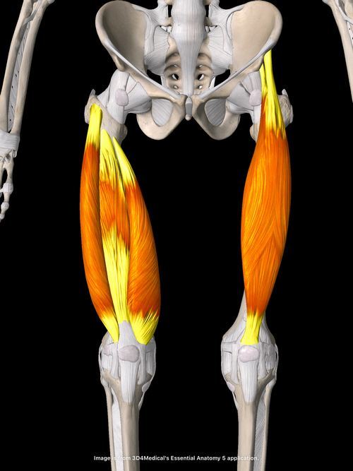 これらの筋肉は膝蓋骨(膝のお皿のこと)の内側、真ん中、外側にそれぞれ付着しています。