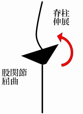 それぞれに「脊柱伸展・屈曲」「股関節屈曲・伸展」と記入してありますが、骨盤が傾斜するということは、骨盤付近の関節運動が起こっているということになりますので、腰椎部や大腿部の筋肉が自然長よりも引き伸ばされたり、逆に緩められたり影響をうけます。
