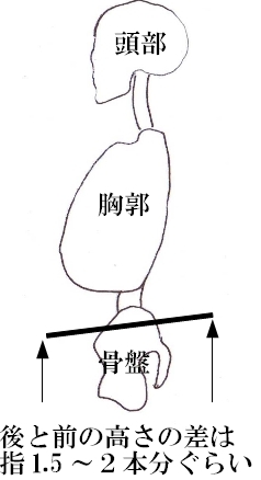 好ましい骨盤の傾斜には、いろいろな考え方があり、腸骨の隆起部である上後腸骨棘と上前腸骨棘の高さの差が指1.5~2本分が良いという人もいます。