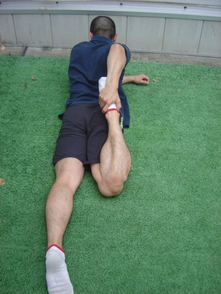 外旋六筋のストレッチの一つに、今回問題となっている「膝を胸に抱えるストレッチ」があります。一番行いたいストレッチであるにもかかわらず、股関節の詰まりが原因で、十分にストレッチを効かせることができなくなっています。
