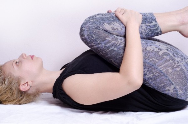 そこから皮膚やお腹のお肉を股関節の付け根から離す方向に引き上げてから、胸に膝を抱えるストレッチを行っていきます。
